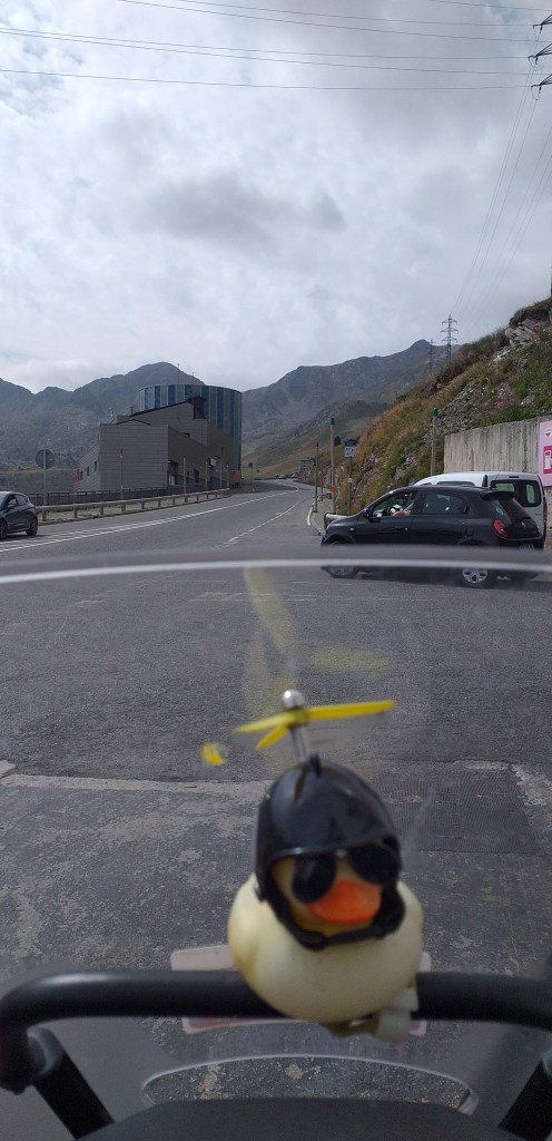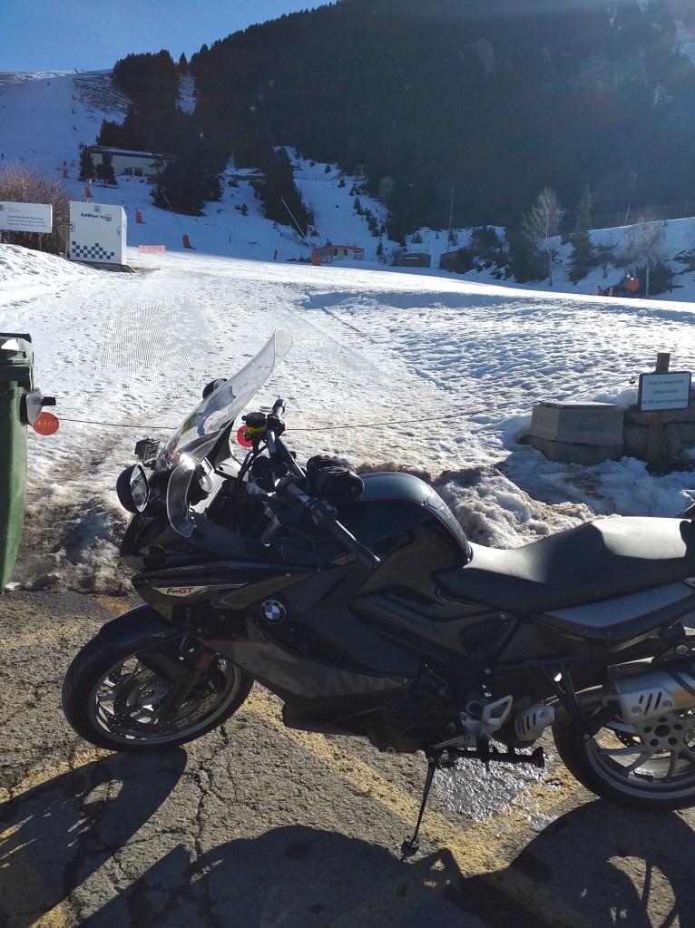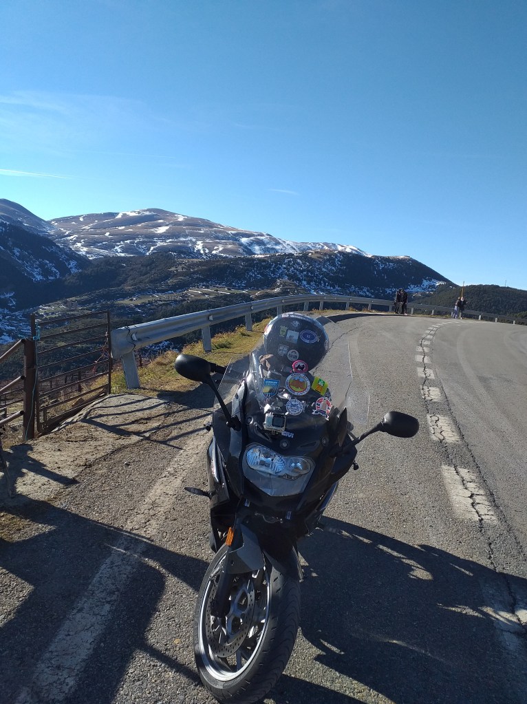 Muy poca nieve, únicamente la que fabrican con cañones para poder mantener las pistas abiertas, pero la carretera fenomenal, seca y con esas curvitas que los que conocéis la zona, sabéis que son maravillosas. Subo a una terraza encarada al sol y me desayuno un buen bocadillo. Charlo un rato con dos motoristas que me siguen en redes y que me encuentro arriba de pistas y sigo ruta.