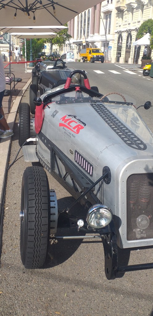 El calor en Mónaco es insoportable, suerte que una vez vista la plaza y unos cuantos cochazos, hay poco que ver, paseo hasta el puerto, hidratarnos, unos helados y volvemos a la ruta de hoy. Algunos compañeros se dieron una vuelta con un coche de carreras antiguo.