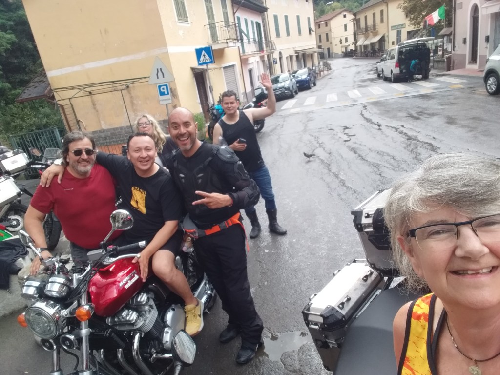 Volvemos a la carretera de la costa, que está muy congestionada y un poco después de pasar a Italia a la altura de Ventimiglia subimos por la SP64, una preciosa carretera estrecha. Al llegar a Pigna, paramos en un bar con una terracita preciosa y empieza a llover…a diluviar. Así que nos tomamos algo tranquilos, van llegando los grupos de manera que llenamos el bar. Consultado el radar, tenemos para 20 minutos. Esperamos!!!