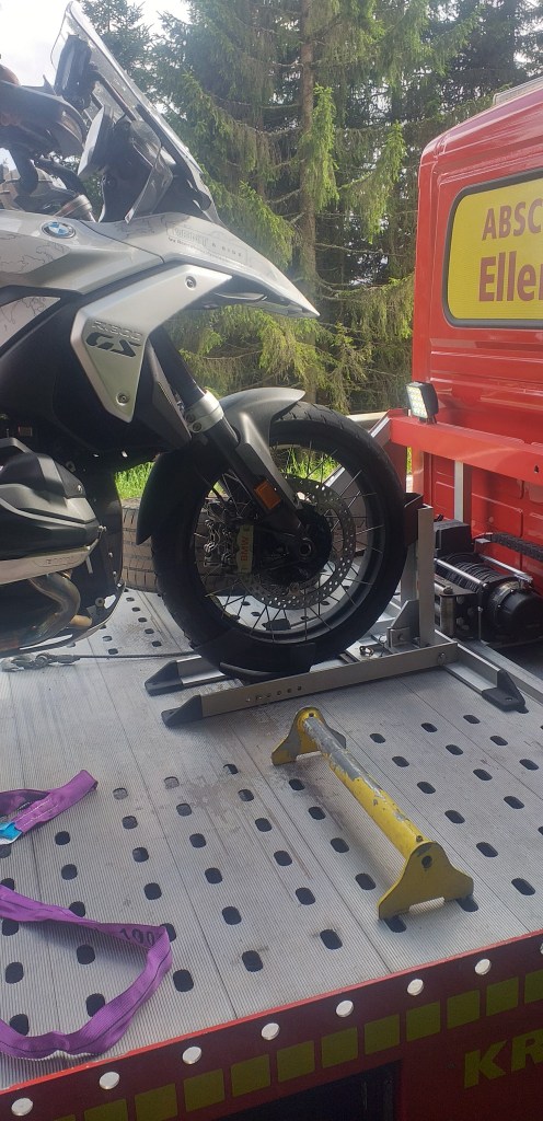 El circuito está en Spielberg a unos 80 Km de Graz y optamos por una carreterita entretenida que pasa por muchos pueblos diseminados en el valle y nos hará cruzar el puerto de Gaberl. Unos cuantos metros antes de llegar al puerto, uno de nuestros compañeros tiene un desafortunado accidente, por suerte sin gravedad pero con la necesidad de hacer parte con la policía y ser atendido en un hospital. El grupo se separa, unos cuantos seguimos hasta el circuito, otros se quedan para poder hacer las declaraciones pertinentes. La Van, con Alex, se irá al hospital para recoger a nuestro compañero una vez visitado. Pau y Carme se quedan a la espera de la grúa, para retirar la moto.
