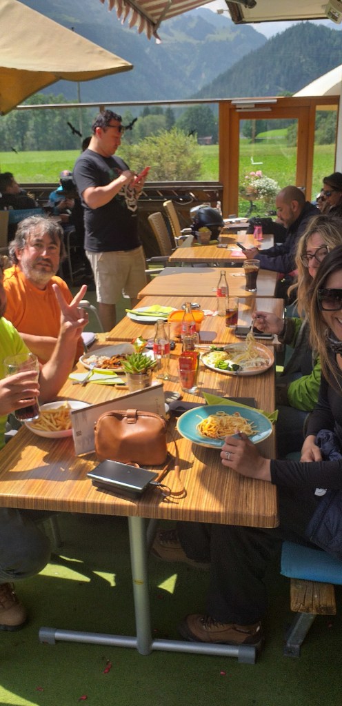 El restaurante que teníamos planificado para comer, estaba cerrado (por suerte!!!) ya que Pau, nos lleva….por casualidad…. a parar en la Gasthof Pensión en Hagerau (Austria), preciosa su terraza trasera con vistas a un precioso prado y una cascada. Si vais, que os lo recomiendo, pediros la sopa de queso….ummmmmm