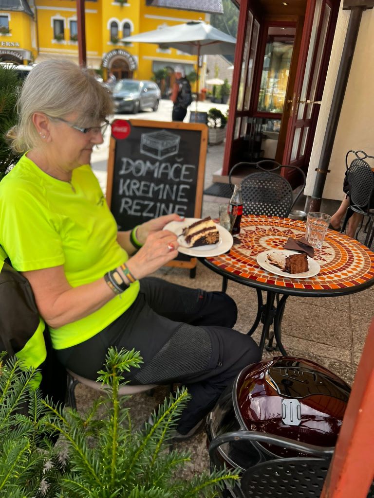 Paramos a comer en Kranjska Gora, famosa estación de esquí de Eslovenia y enclavada en los Alpes Julianos. Esta vez, aparco el régimen, encuentro una granja con un aparador de pasteles caseros y caigo en la tentación, de primero un pastel de zanahoria y de segundo una pastel de chocolate.