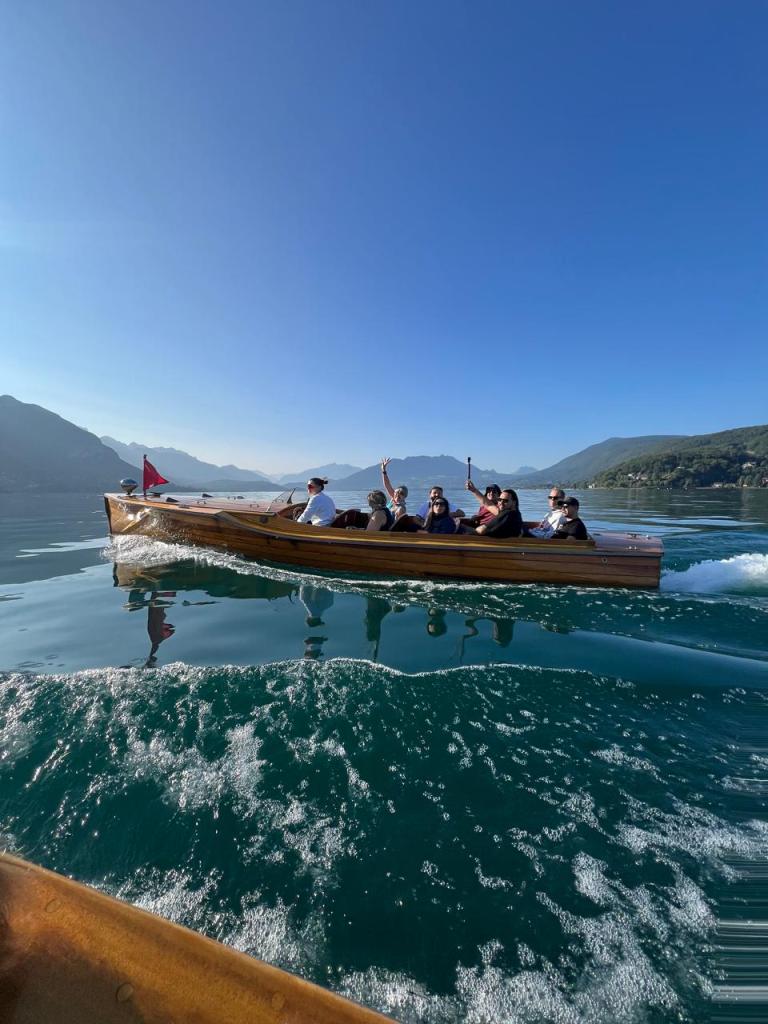 Empezamos el día en Annecy y nada más y nada menos que con un paseo en lancha, aparcamos motos y nos subimos en dos lanchas preciosas para dar una vuelta por el lago pero…..que pasa? un atrevido y aventurero integrante del grupo, pide en matrimonio a su novia con un cartel desde un puente: