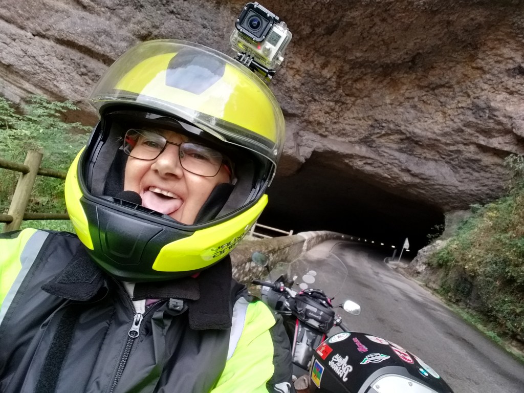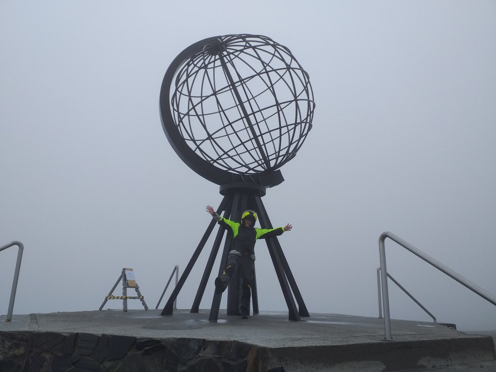 La humedad es del 99% y el frío es intenso, unos 3 grados, el viento es racheado de un lado y del otro, así que vamos dando bandazos con la moto hasta llegar arriba. Realmente hay muy poca gente en el parking, alguna autocarabana y otra moto. Nadie en el exterior, intento meter la moto hasta la bola, pero Mirelle es tremendamente legal y optamos por ir andando. HEMOS LLEGADO!!!! No es una maravilla, el paisaje ni lo vemos, pero la emoción nos embarga, nos abrazamos y empezamos a chillar y hacer fotos!!! Todo lo demás no vale la pena, una tienda carísima, todo lo que venden lo encontramos a mitad de precio en Bergen, ojo si vais!!! El restaurante ya estaba cerrado.