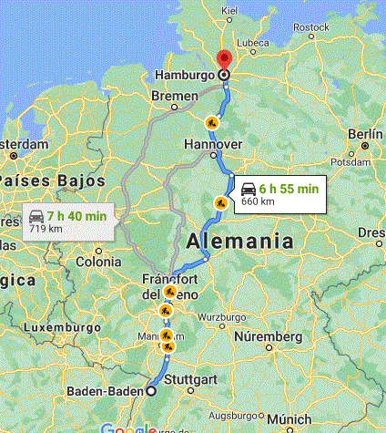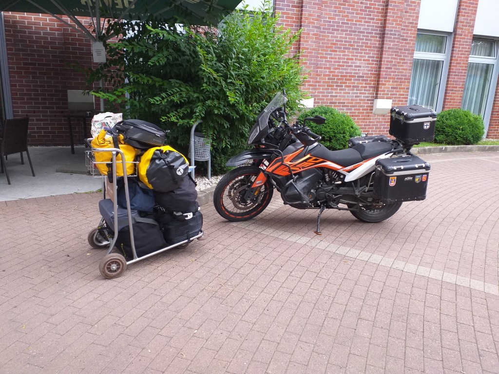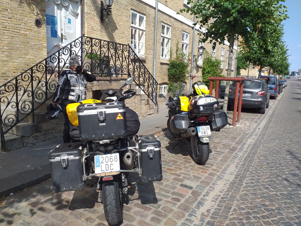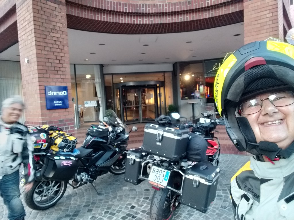 El día de ruta se nos hace un poco largo y el culo empieza a quejarse, llegamos a Bremen a las 9 de la noche, ya teníamos reservado el hotel desde las 5 de la tarde aprox. en booking lo anunciaban con parking, pero al final no hay para motos, nos mandan a uno publico cercano y tampoco admiten motos, así que finalmente las aparcamos en la plaza delante del hotel y yo me quedo super tranquila ya que llevo mi dispositivo Atlantis que me avisa de cualquier movimiento de mi moto. Es el hotel Dorint City, todo perfecto menos las recepcionistas que ayudan poco para entendernos y hablan en ingles como si estuvieran jugando al telegrama. Salimos a cenar cerca del hotel y preparamos la ruta del día siguiente, será corta ya que hemos cruzado toda Alemania y estamos muy cerca de Travemunde, donde tomaremos el Ferry.