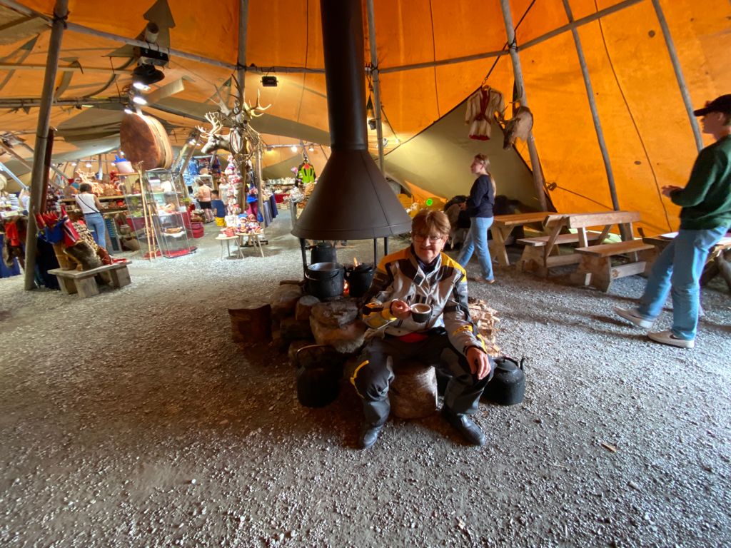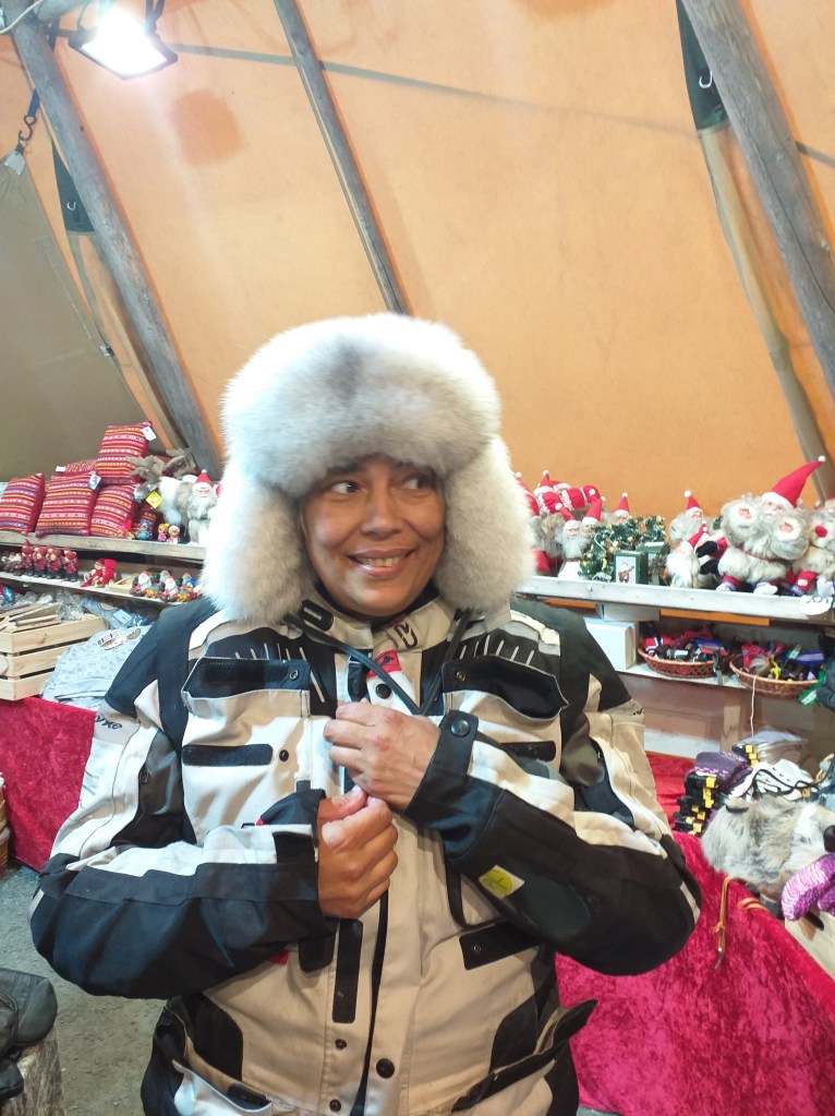 A medio camino encontramos una tienda sami con muchas cosas chulas de la zona, trajes y zapatos típicos, pieles, cuernos, recuerdos…. Mirelle se compra una preciosa piel y un gorro para cuando vaya a Pinguinos, que le enviarán a su casa y yo me compro un trozo de piel para el asiento de la moto. Además nos tomamos una buena sopa de reno. La chica que nos atiende ha pasado bastante tiempo en Alicante y nos entendemos genial.