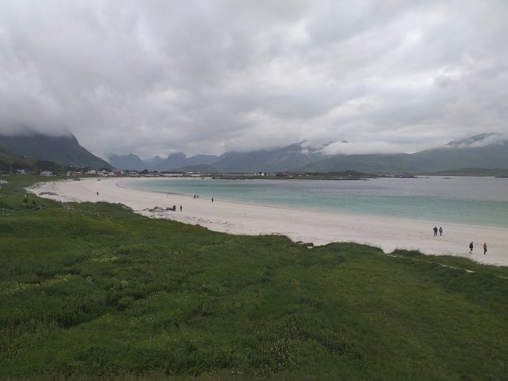 Seguimos por la E10 que nos cruzará todas la Lofoten hasta el final. Desde luego, es un auténtico paraíso de colores, mar, cielos, montañas, pueblecitos, playas de arena blanca y agua turquesa y cristalina, allí donde te mueves es precioso y hay carreteras o pistas que te llevan a lugares increíbles. La circulación es lenta, pero no necesitas más. Hasta nosotras vamos frenando continuamente para no dejarnos detalles.