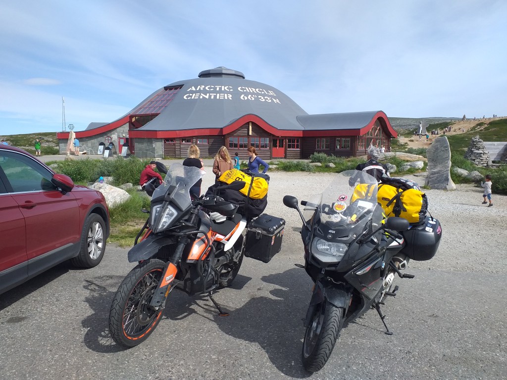 A mitad camino volvemos a cruzar el círculo parlar Ártico, está en una zona bastante inhóspita, con poca vegetación y alejada de núcleos urbanos. Han construido un centro de visitantes que no deja de ser una tienda de recuerdos y algunos monumentos de piedra para hacerte las correspondientes fotos. Compramos los adhesivos para las maletas y seguimos!!
