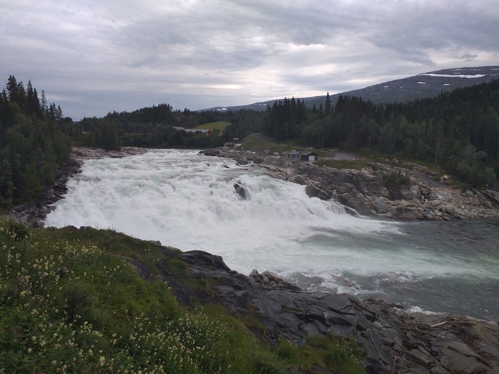 Hemos circulado todo el día por la E6, mucha carretera de alta montaña y nos hemos encontrado con algún corte por obras que aprovechamos para descansar. Casi todo el día acompañadas por un rio que, a veces está encabritado y forma preciosas cascadas y a veces está tranquilo y a penas parece moverse. El sol está presente durante todo el día, pero a las 7 de la tarde, se cierran las nubes y nos cae un buen chaparrón, así que buscamos cabaña, hoy con dificultades. Finalmente encontramos un camping, con su correspondiente rio y que tiene un supermercado cercano donde reponer mercancía.