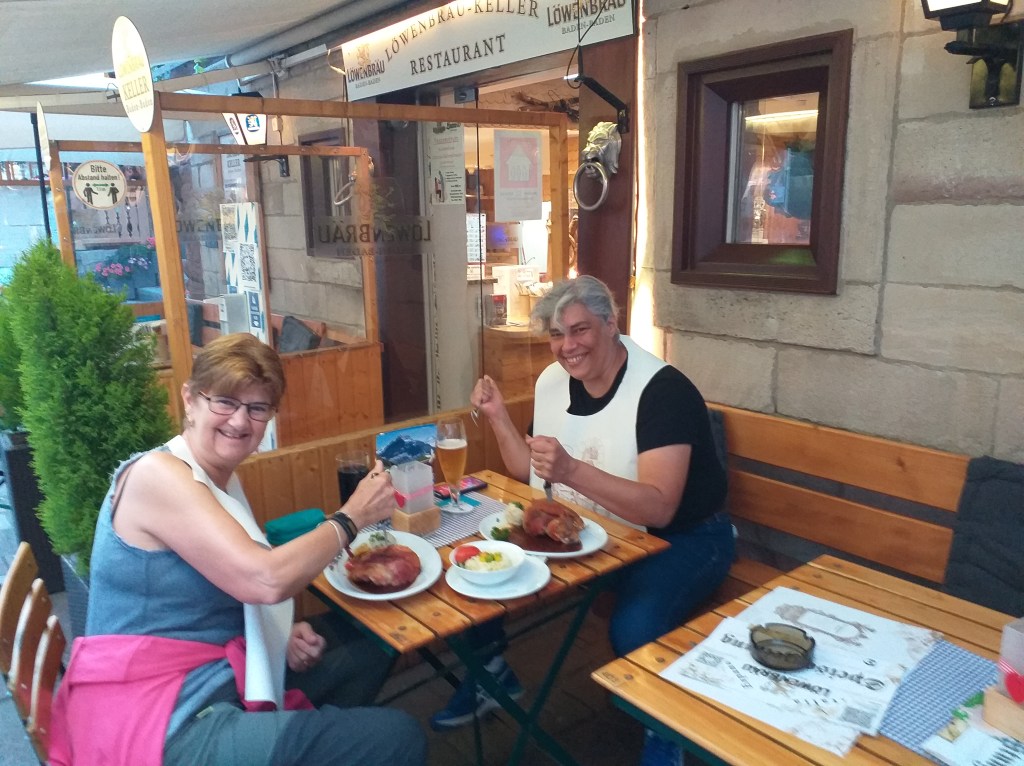 Como negativo, es imposible aparcar las motos en la ciudad y el parking más cercano está a tomar por saco, después de dar varias vueltas a la ciudad, las dejamos en un hueco que encontramos entre dos coches y unos camareros super amables nos guardan chaquetas y cascos para que podamos patear cómodamente. Al volver nos tomamos algo allí mismo previa presentación de nuestro pasaporte covid, que solicitan en los restaurantes alemanes para darte mesa en interior.